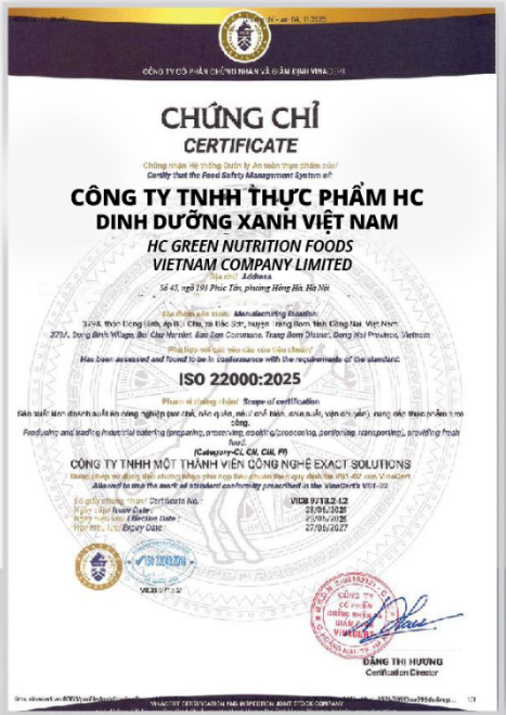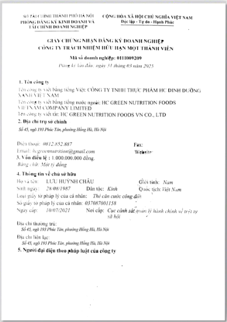 Công ty TNHH Thực phẩm HC Dinh dưỡng xanh Việt Nam, xin trân trọng gửi tới Quý vị lời chúc sức khỏe và thành công rực rỡ!